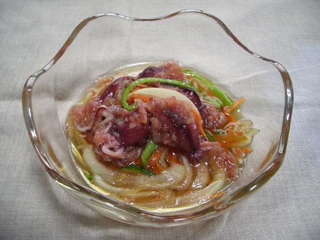 ④③のほたるいかを、漬け込み野菜と一緒に盛りつける。