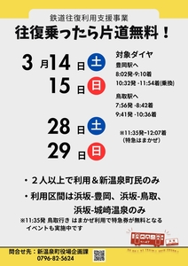 新温泉町では、今後の鉄道運行の持続的な確保と利便性の向上を図るため、町民の皆さんの鉄道利用の増加や路線維持に対する思い、愛着を深めてもらうことを目的として、昨年度に引き続き、JR山陰本線利用促進「鉄道往復利用支援事業」を実施します。