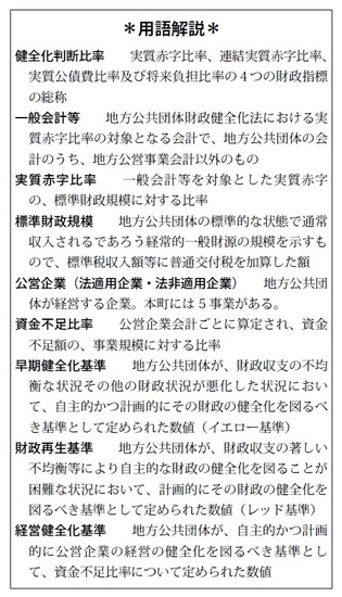 この4つの指標には、「早期健全化基準」(黄信号)と「財政再生基準」(赤信号)が設けられています。指標のうち1つでも国の定める基準を超えると早期健全化団体となり、外部監査制度の導入や財政健全化計画等の策定義務などが課せられ、国・県の関与のもと財政健全化に取り組むことになっています。