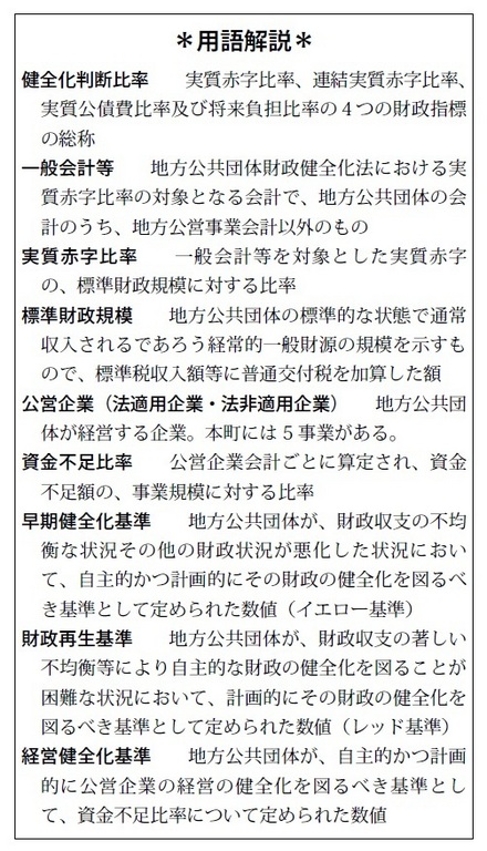 地方公共団体の財政の健全化に関する法律の施行により、町の財政状況を判断するために設けられた「健全化判断比率」と呼ばれる4つの指標と公営企業会計の経営健全化の指標となる「資金不足比率」を毎年度決算時に算定し、監査委員の審査に付した上で議会に報告し、町民の皆さんに公表することが義務づけられています。
