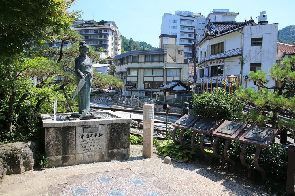 荒湯から春来川にかかる森下橋を渡ると湯村温泉がNHKドラマ「夢千代日記」の舞台になったことを記念して立てられた夢千代像があります。この夢千代のブロンズ像は、夢千代を演じた吉永小百合さんをモデルにして昭和60年4月に建立されました。また、主人公の夢千代が胎内被爆者だったことから、広島市旧庁舎を解体する折(昭和60年11月)に、被爆当時の敷石をご寄贈いただき、夢千代像の台座に利用しています。