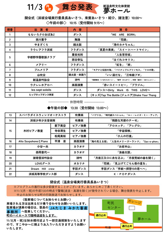 新温泉町民センターの駐車場が満車の場合は、歌長の「JAたじま みかた畜産事務所」(外部リンク)へ駐車してください。会場まで随時送迎いたします。 なお、11/3(月・祝)は知水橋付近より一部交通規制をいたしますので、新温泉町民センターへはすこやか~に側よりお入りいただきますようお願いいたします。 ~11/3 温泉会場へのマイクロバスによる送迎について~
