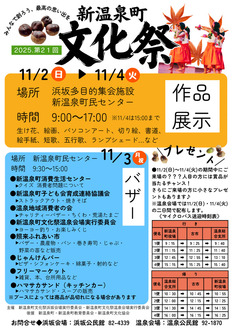 日程:令和7年11月2日(日)~4日(火)午前9時~午後5時 ※11/4は午後3時まで 会場:浜坂多目的集会施設 および 新温泉町民センター 生け花、絵画、書道、手芸作品など多数の力作を展示しておりますので、ぜひお越しください! ★11/2(日)~11/4(火)の期間中にご来場の???人目の方にはプレゼントが当たるチャンスが!!