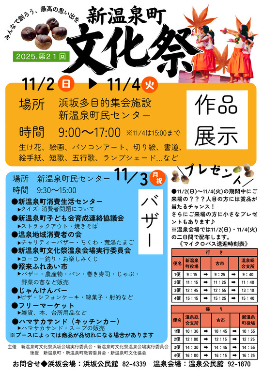 事務局:浜坂公民館 TEL:0796-82-4339 FAX:0796-82-5159 <温泉会場>新温泉町文化祭温泉会場実行委員会 事務局:温泉公民館 TEL:0796-92-1870 FAX:0796-92-2392 後援:新温泉町、新温泉町教育委員会、新温泉町文化協会 お問い合わせ