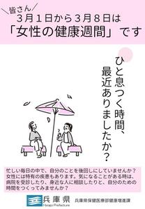 毎年3月1日から3月8日までを「女性の健康週間」とし、女性の健康に関する知識の向上と、女性を取り巻く健康課題に対する社会的関心の喚起を図るための国民運動を展開しています。 女性は、女性ホルモンの変化に伴い、人生の各段階(思春期、成人期、更年期、老年期)において心身の状況が変化します。からだのサインを見逃さないように、自分自身の健康に目を向けましょう。定期的に健診等を受けることをお勧めします。なお、町ぐるみ健診、女性のがん検診のご案内は、全戸配布で申込受付後、準備が整い次第ご案内しますのでご確認ください。 厚生労働省ホームページ:女性の健康づくり スマートライフプロジェクト:女性の健康週間「すこやかな人生を送るためにカラダのためにできること」 兵庫県:女性の健康づくりについて 女性の健康を支援する、厚生労働省研究班による情報サイトがあります