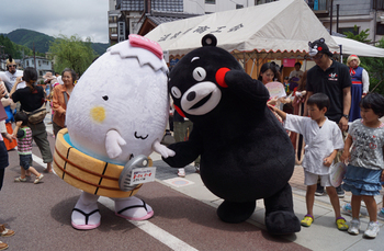 くまモンは、湯村温泉のキャラクター「湯~たん」のお友達で、湯~たんが招待しました。
