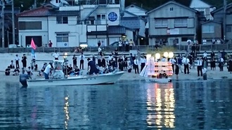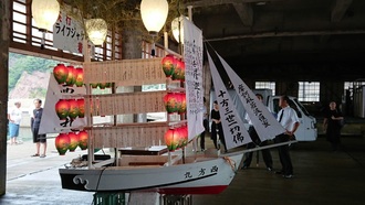 毎年8月15日に、精霊船(盆船、サラエ船とも)を作ってお盆で迎えていた仏を送り出す行事です。かつて精霊船は初盆を迎える各家々が作っていましたが、現在は実行員会と地区の有志で一隻の船を作ります。15日夕方、地区内にある龍満寺の住職による読経により仏送りが始まります。初盆の家を中心に参加者は焼香を行ったのち、精霊船を浜まで移動し、初盆の家の手によって海に流されます。以前は有志が海に入り途中まで精霊船を曳いていましたが、現在は最初から船で曳航し、ひとしきり湾内を巡ります。 諸寄の精霊船は、かつて麻の殻(オガラ)で組み上げていましたが、現在は木製の小型船を土台に使用しています。精霊船の帆には、「南無釈迦牟尼仏」と墨書され、初盆を迎える仏の戒名が記されています。船の前後には提灯を掲げ、側面には各家から持ち寄られた戒名等を記したお札が飾り付けられています。加えて初盆の家は花を飾りますが、かつては団子やお菓子、精霊棚のお供えなどのほか、新仏の数だけ10センチメートル程度の人形を載せていました。現在では花以外は乗せていません。 過去に行われていた精霊船流しは、初盆の家が一軒ごとに船を用意し、海に出した船はそのまま沖へ流していました。その後、船に使用する材料が変化し海中に沈みにくくなったことや、環境に対する認識が変化したこともあり、祭りの翌日に船の飾りを外し、土台の船部分を翌年また使用する現在の形になりました。社会の変化によりその姿を変化させつつも、地区の人々の手によって守られてきた但馬地方の貴重な盆行事のひとつです。 (令和4年9月1日 兵庫県登録無形民俗文化財)