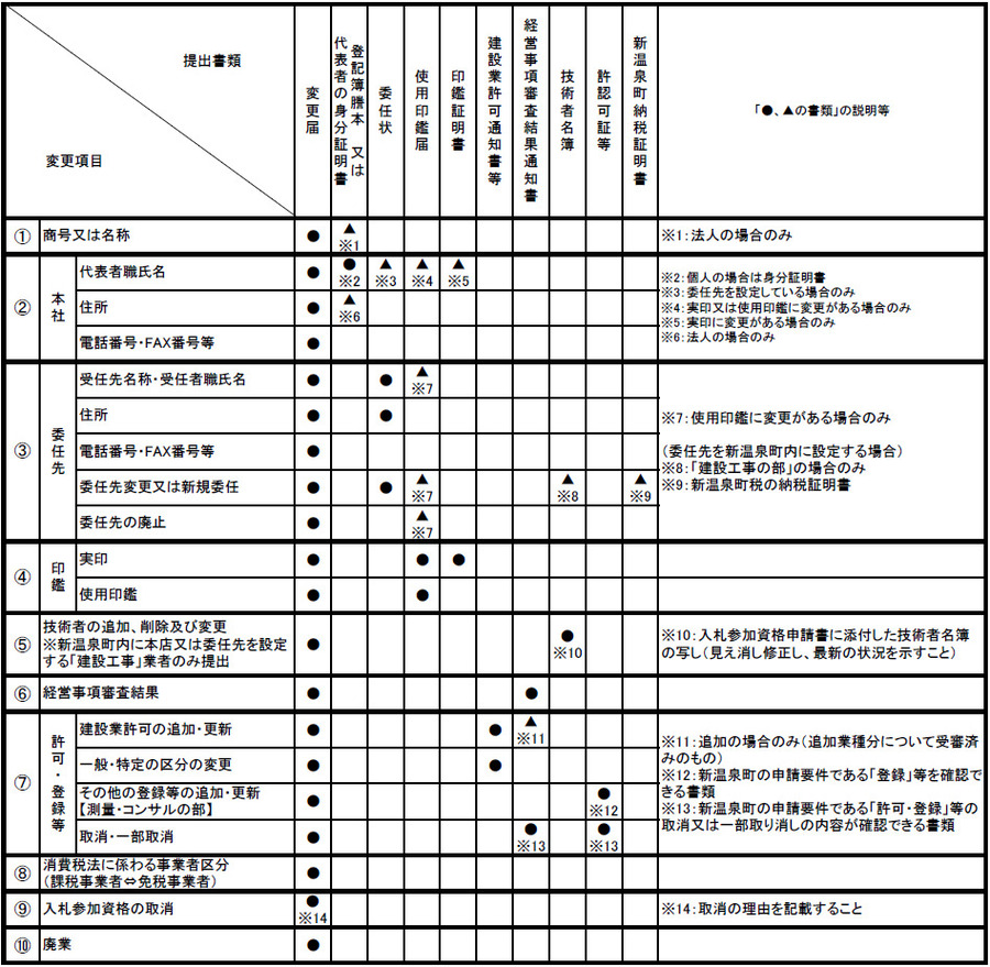 ・代表者又は受任者(新温泉町との契約当事者である者のみ) ・希望業種、取扱品目等の変更 ・許可等の追加・更新 ・経営事項審査結果 等 届出が不要な事項