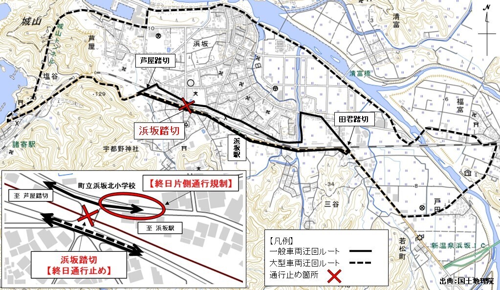 県道浜坂港浜坂停車場線の道路改良工事に伴い、令和8年2月16日(月)から浜坂踏切の終日車両通行止め及び県道の終日車両片側通行規制を行ってきましたが、通行規制の解除日を次のとおり変更します。